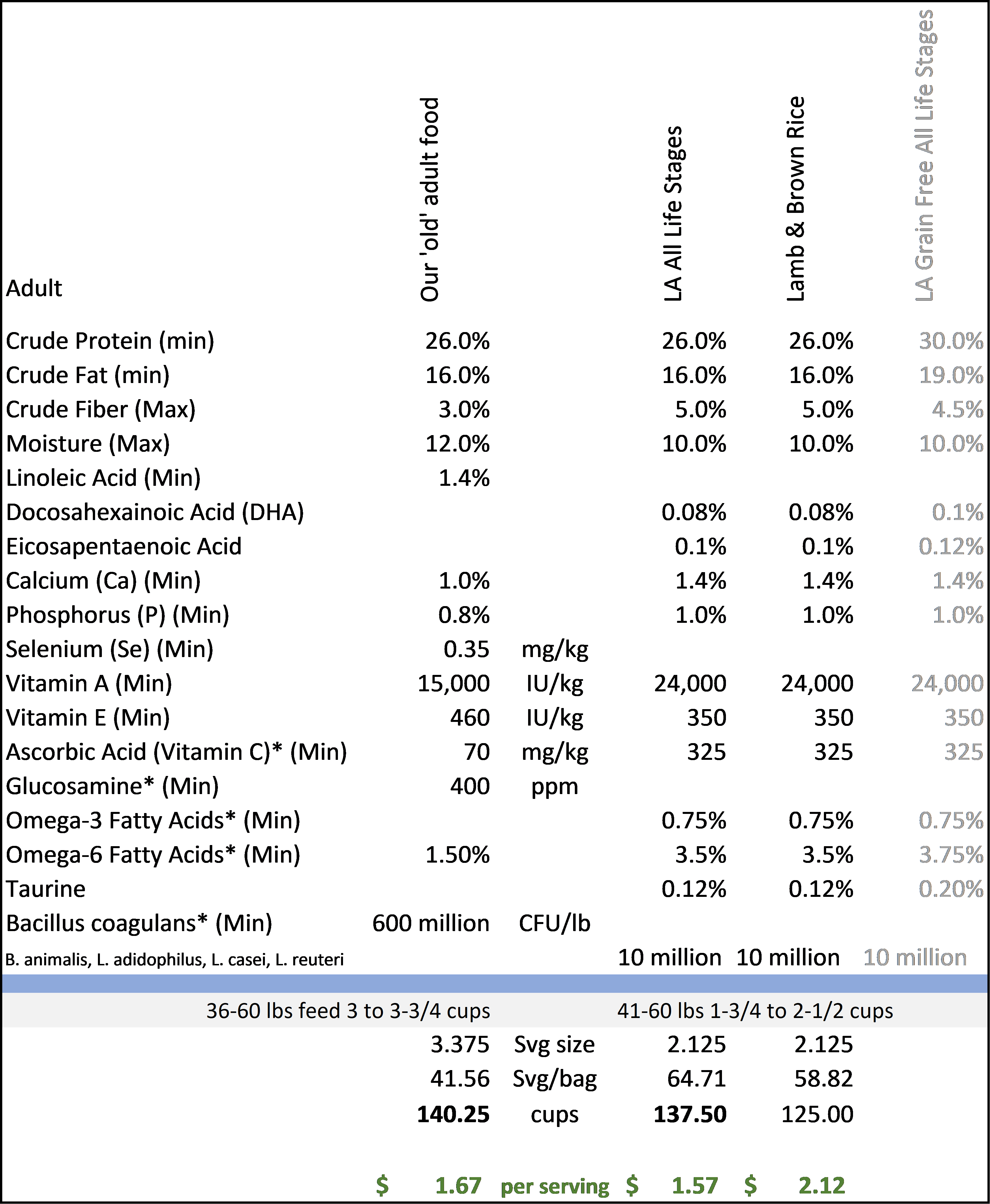 I wanted to make a comparison serving to serving, so of course I created a spreadsheet, lol! There are some key differences that I appreciate in the Life’s Abundance food. Also, per serving, Life’s Abundance All Life Stages food is less expensive than what I had been feeding! With my dogs, that saves me about $1 per meal!