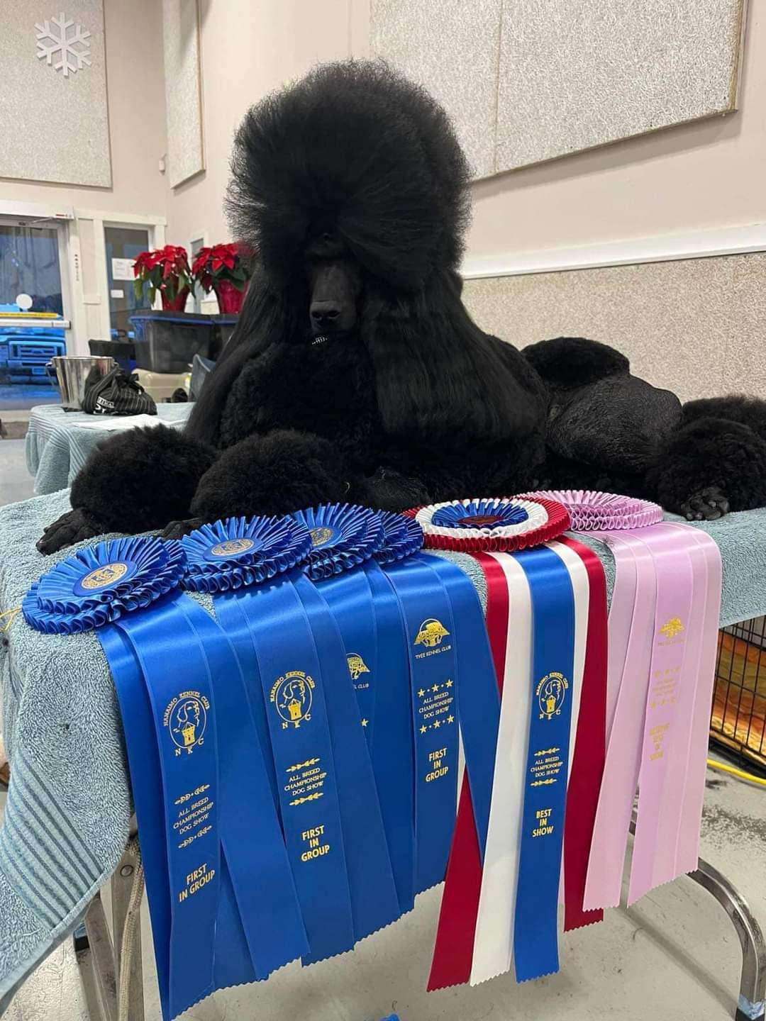 EZ is no stranger to the spotlight, currently holding the 2023 prestigious title of #1 Poodle in Canada across all varieties and ranking as the impressive #3 Non-Sporting dog. At the last dog show of 2023, EZ brought home four Group 1s, a Reserve Best in Show and a BEST IN SHOW! His accolades speak volumes about his outstanding qualities and the promise he brings to our breeding program.