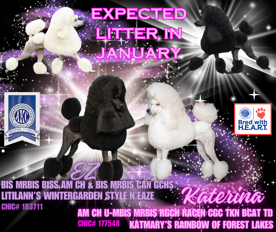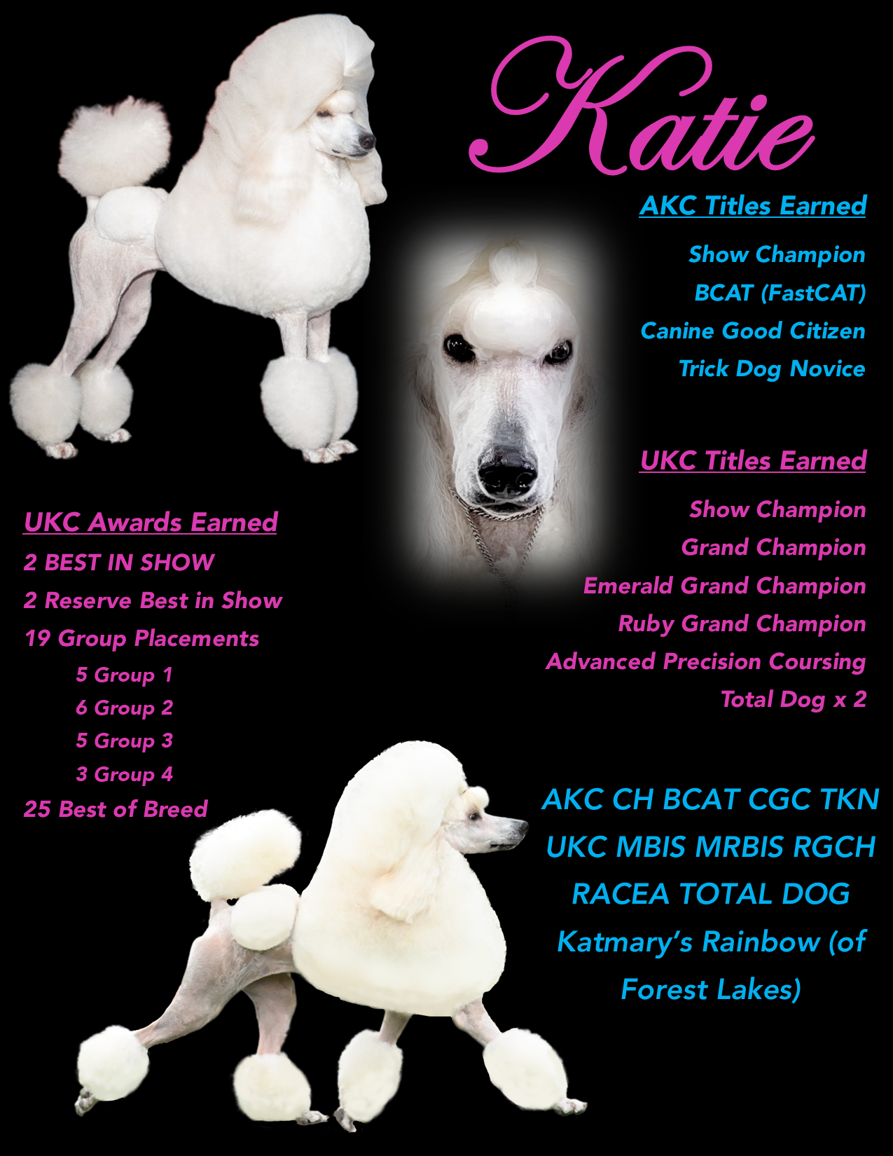 Katie, a shining star in her own right, boasts an impressive track record earning her AKC championship in just 3 weekends, her UKC Emerald and then Ruby Gemstones with 2 Best in Show and 2 Reserve Best in Show Awards, 25 Best of Breed awards (her first of which was at 8 months of age), and 19 Group placements (five Group 1, six Group 2, five Group 3 and three Group 4). Even taking time off for her AKC career and having a litter, Katie finished at UKC’s #5 Standard Poodle for 2023. She is not only beautiful and showy but athletic as well, with titles in FastCAT and Precision Coursing. And last but not least, Katie has undeniably proven her sound temperament in all circumstances, illustrated by her amazing drive and off switch and demonstrated by her Trick Dog and Canine Good Citizen titles.