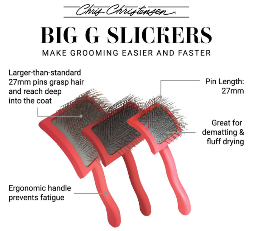 Brushes – Big G example: long pins, more dense pins – good for fluffing poodle coat and eliminating separated hair (like after being wet).