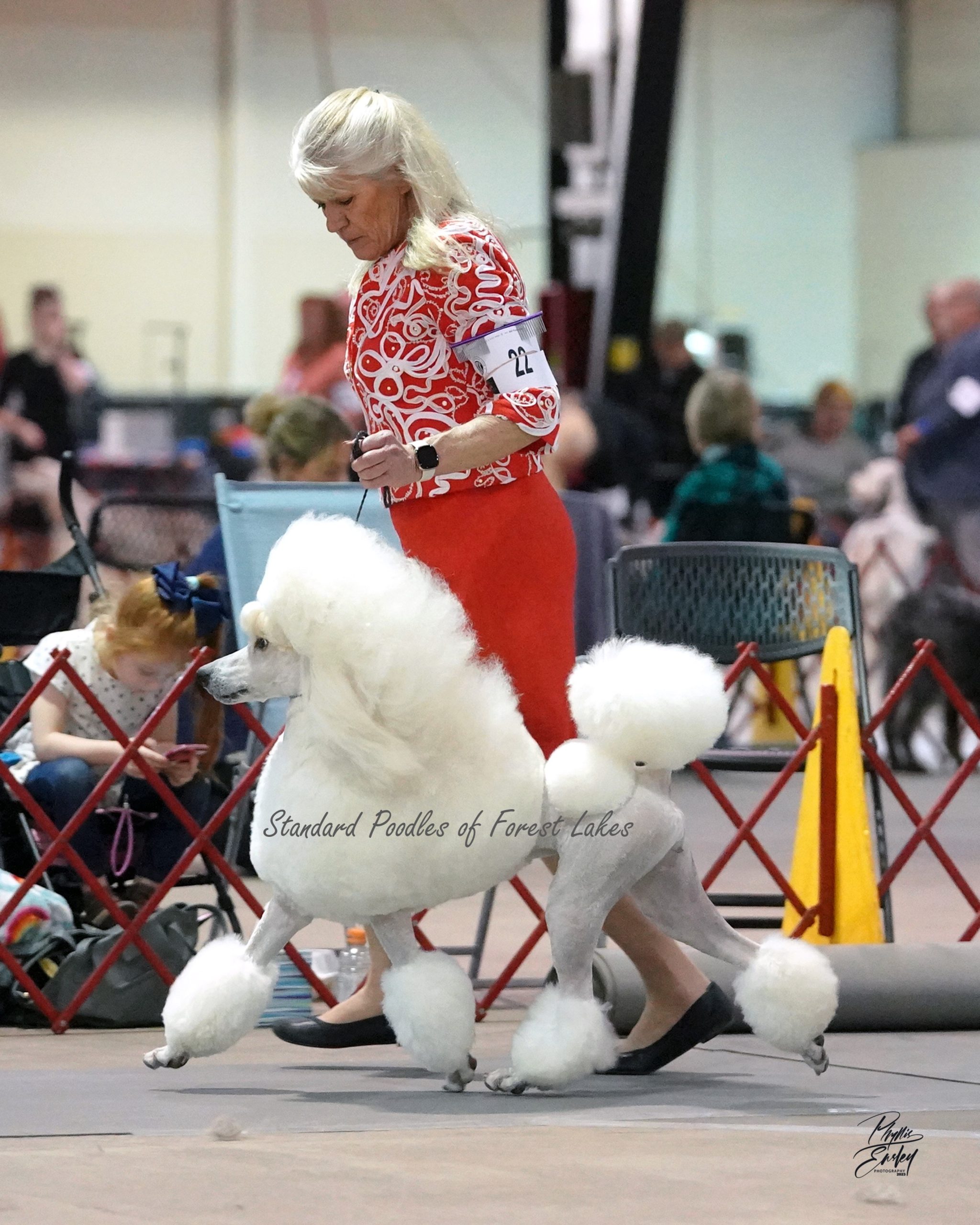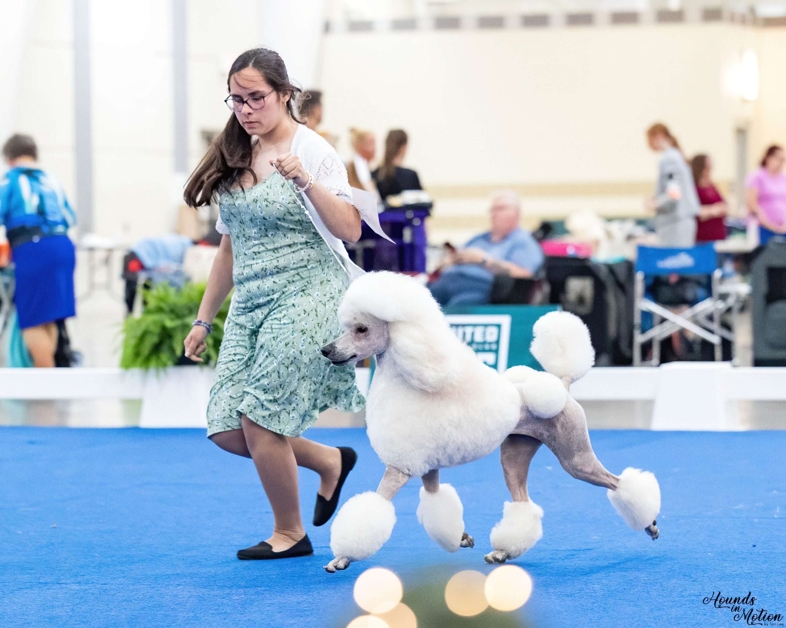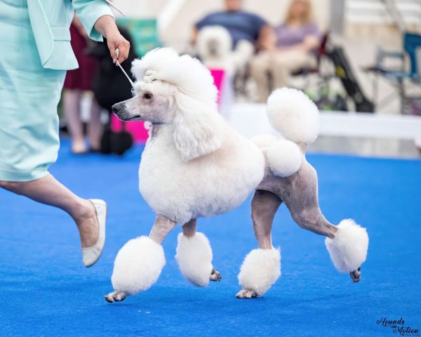 Katie embarked on her AKC journey in 2023 and swiftly garnered a 3-point major and a 4-point major within two weeks of joining handler Ann Rairigh. Her second show in March rewarded her with a 5-point major, leading to the completion of her Championship on March 31, 2023, at the Key to the Sea Poodle Specialty.