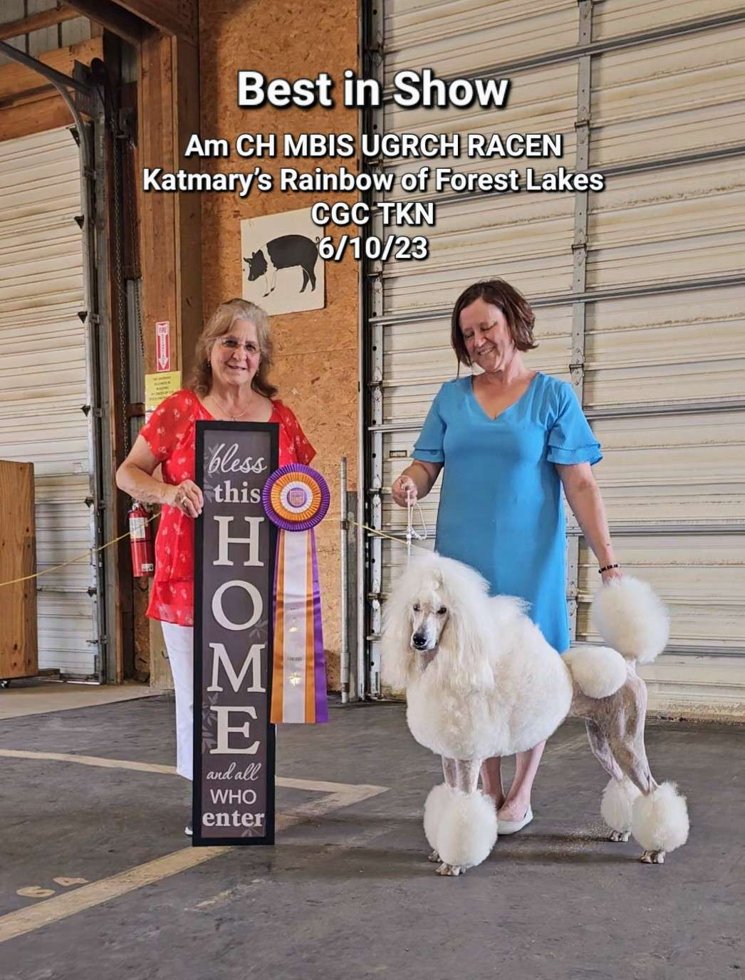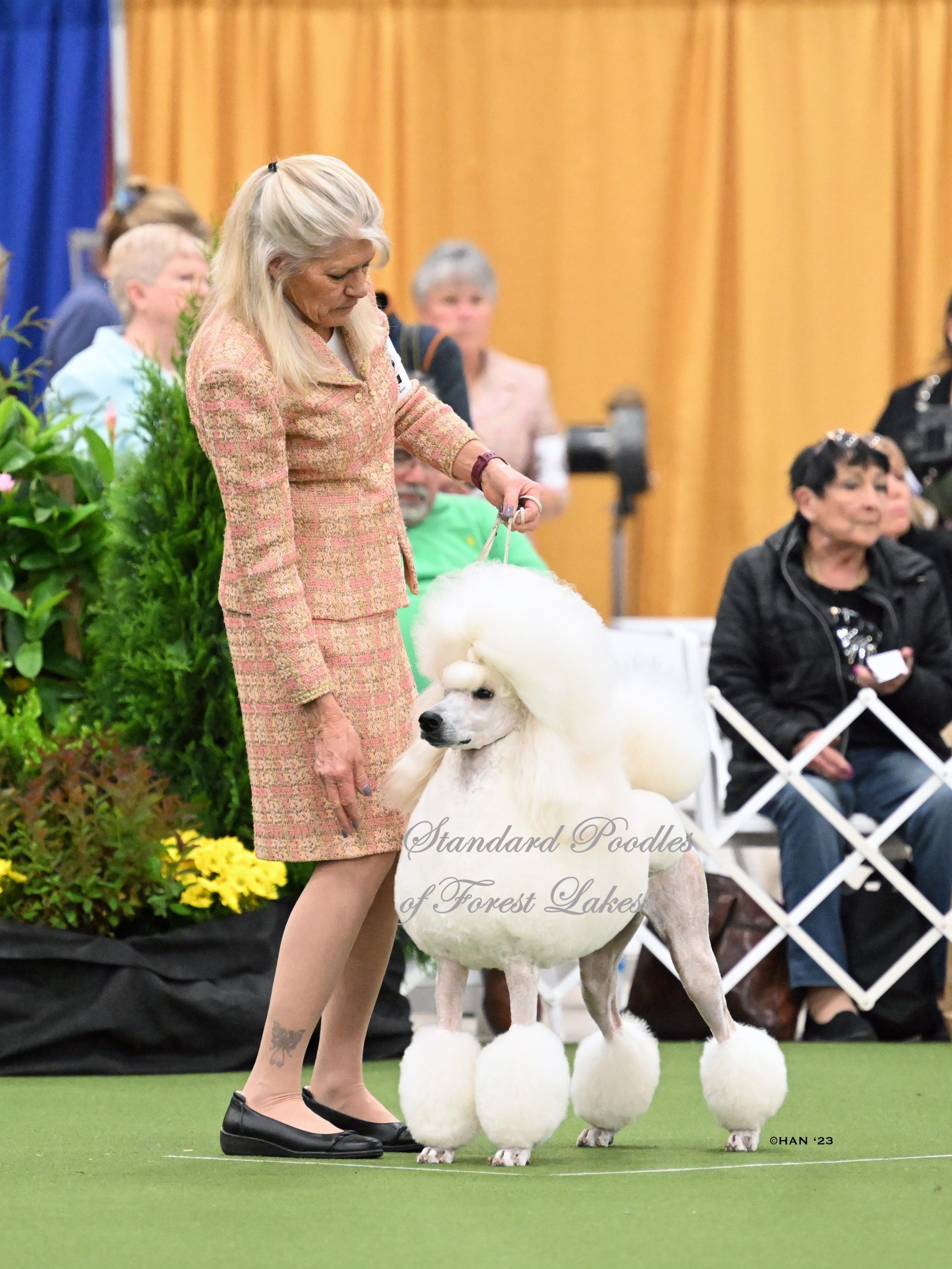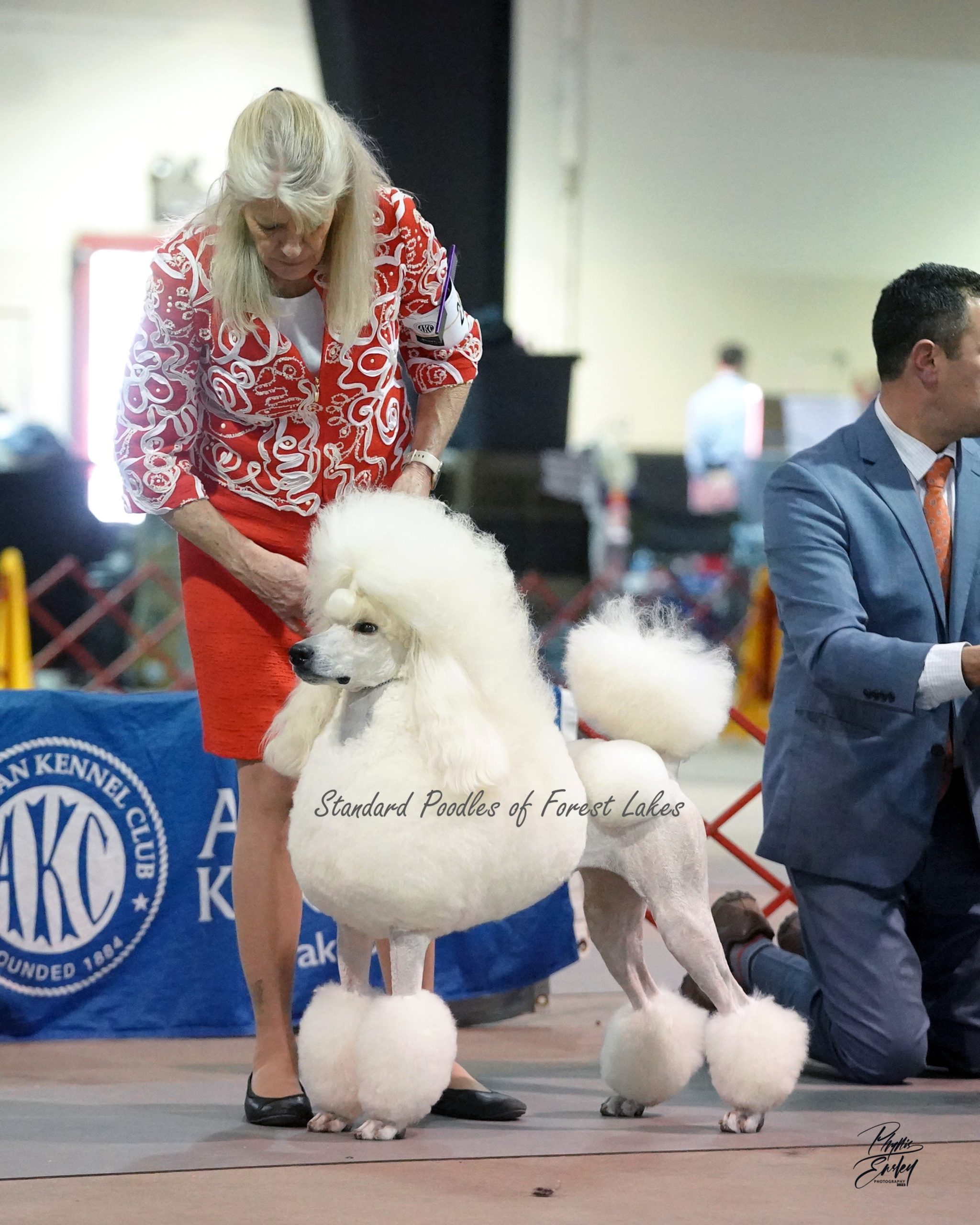 Katie embarked on her AKC journey in 2023 and swiftly garnered a 3-point major and a 4-point major within two weeks of joining handler Ann Rairigh. Her second show in March rewarded her with a 5-point major, leading to the completion of her Championship on March 31, 2023, at the Key to the Sea Poodle Specialty.