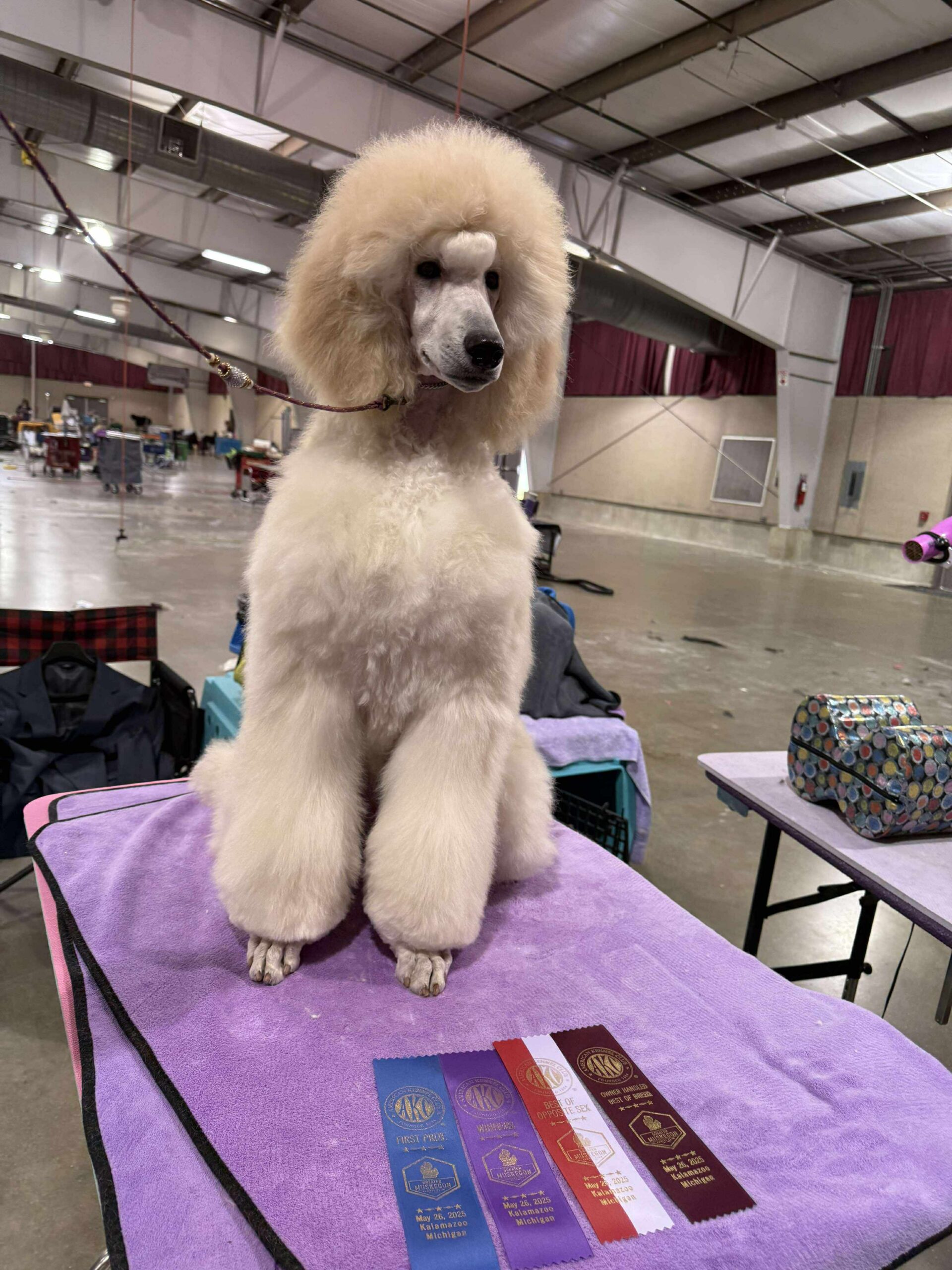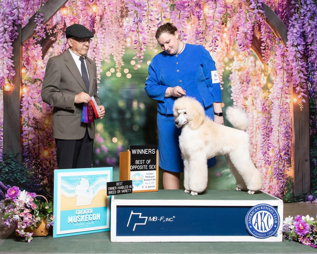 Co-owned with Lakeridge Standard Poodles, Simone is a standout with elegance and presence. She carries the strength of her pedigree and has already demonstrated her potential winning breed multiple times over other standard poodle pups!