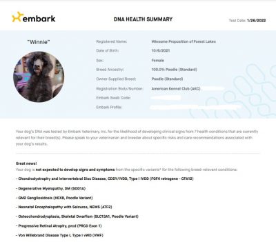 All SPFL parents are fully health tested, including DNA tests for all known diseases, and I often choose to complete DNA health testing on puppies as part of the process to choose a puppy to keep for our program. While I do not use Embark‘s breed ancestry or coefficient of inbreeding (COI) measures, I have been very happy with their DNA results for health, color, coat, and other traits.