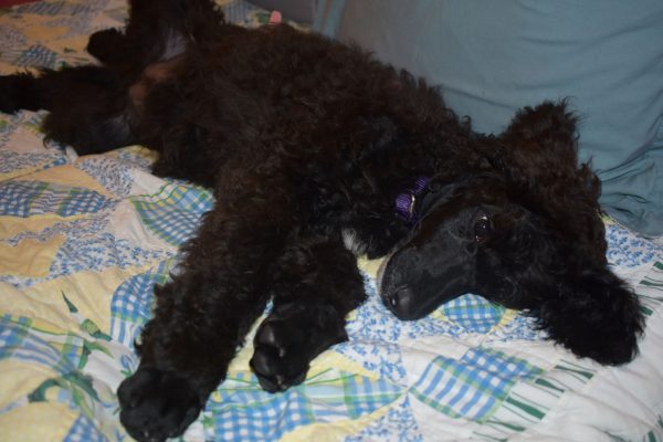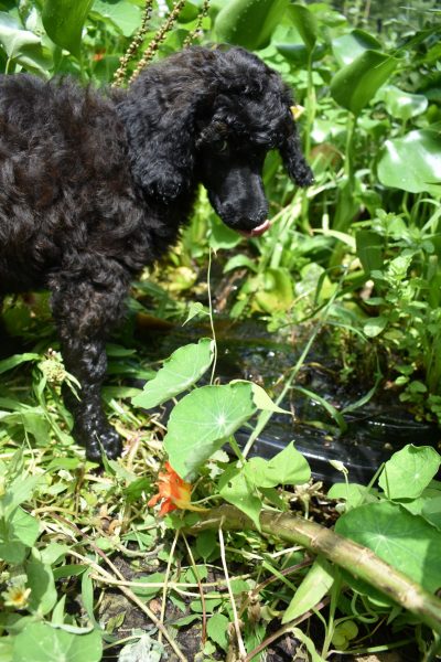 You have done such an amazing job raising her and her canine parents have passed on some first rate smarts and a super engaging temperament – she is just great. She is also soaking wet as often as she can be. It took her a day to figure out how to get past the flowers and to the bubbling fountain in the backyard frog pondlet. On day 2 she mistook the floating planters for terra firma and fell in, but on day 3 she worked out how to place her feet to get a drink from the bubbling spray. She is in the paddling pool everyday, and on her maiden visit to the river she bounced straight into the water before the big poodles had followed the first tennis ball in. I kept her leashed of course, but that didn’t stop Izzy from exploring and within a couple of minutes she had a balled up pair of socks that some fisherman must have dropped. You should have seen her capering in triumph – if she’d landed a prize winning catfish she couldn’t have been more proud.