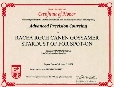 Romeo brings his magic to the conformation show ring, obedience and precision coursing. We will be working on Rally this winter, and hope to add a few more titles in the near future. I can’t decide if I will finish his therapy dog training. People go crazy for a poodle in show coat that they can actually touch. And then people will touch him. So, hmmmmmm. Maybe when he is retired from conformation ????