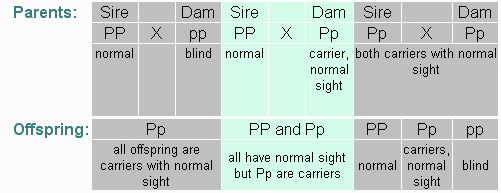 A recessive gene requires two copies—one from each parent—to express a disease or condition. Dogs identified as carriers have only one copy of the gene and will not exhibit symptoms of the disease. Importantly, if paired with a mate who is clear of the same condition, no offspring will suffer from the disease. Instead, some may be carriers, and some may be clear. This table illustrates Progressive retinal atrophy (PRA). Uppercase P is ‘normal’ dominant, Lowercase p is ‘abnormal’ recessive: